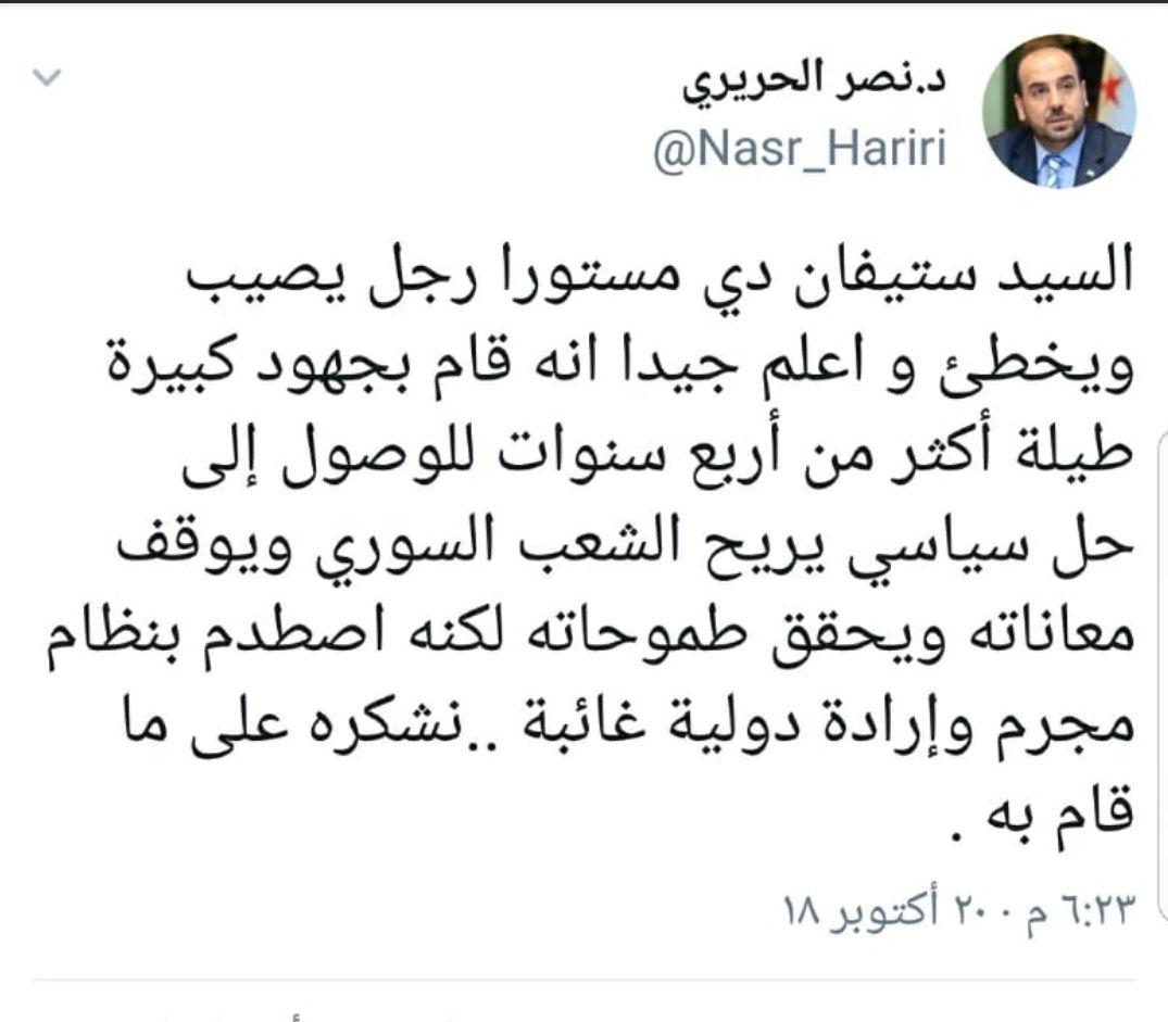 قال لي أحدهم مدافعا عن منشور نصر الحريري الأخير الذي يمدح فيه ديميستورا (الناطق الرسمي باسم بشار الأسد): ” الرجل سياسي – يقصد نصر الحريري- والسياسة تستدعي تغيير في المواقف حسب الوضع”….