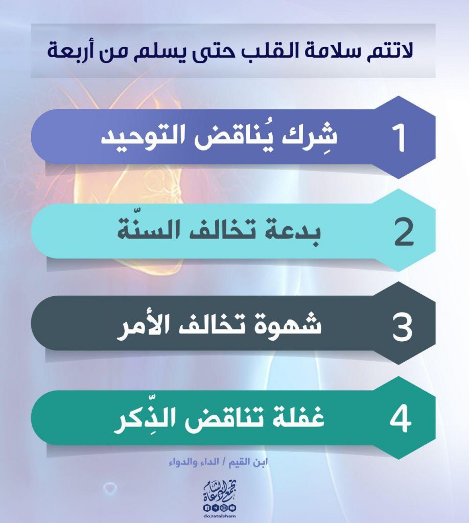 الرئيسية/ملفات وبطاقات دعوية/إيمانيات/سلامة القلب إيمانياتتجمع دعاة الشامصوركاتبملفات وبطاقات دعوية سلامة القلب 2022-02-27 3٬102 سلامة القلب لا تتم سلامة القلب حتى يسلم من أربعة شرك يناقض التوحيد. بدعة تخالف السنة. سهوة تخالف الأمر. غفلة تناقض الذكر. 0 تقييم المستخدمون: 0.93 ( 1 أصوات) الوسومبدعة توحيد ذكر سنة شهوة غفلة 2022-02-27 3٬102