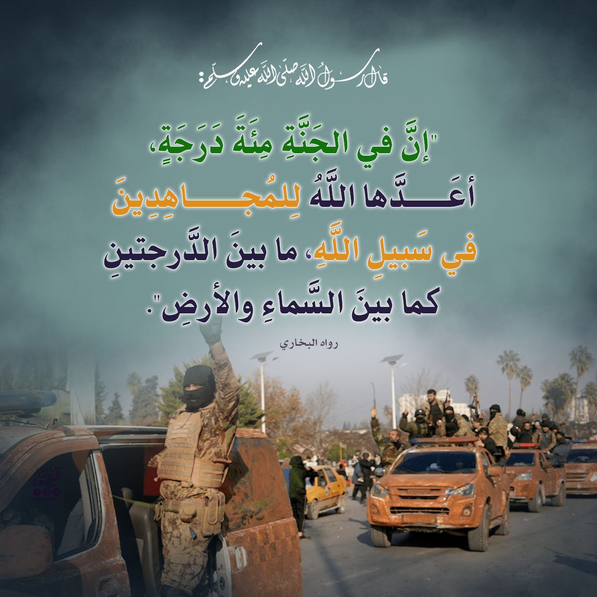 قال رسول الله صلى الله عليه وسلم: «إن في الجنة مئة درجة أعدها الله للمجاهدين في سبيل اللَّه، ما بين الدرجتين كما بين السماء والأرض». رواه البخاري